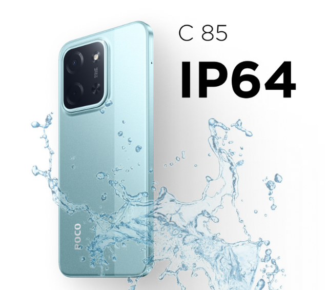 Смартфон POCO C85 готовий до будь-яких випробувань. Його корпус надійно захищений за стандартом IP64, даруючи тобі впевненість у тому, що краплі дощу або випадково розлита рідина не зможуть вплинути на його працездатність.